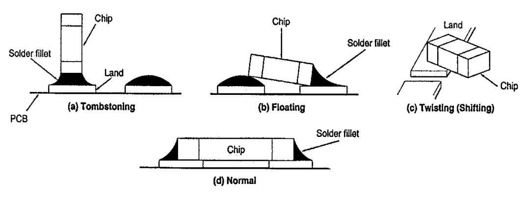 在回流焊過程中,貼片元件兩端電極受到焊錫融化后的表面張力不平衡會產(chǎn)生轉(zhuǎn)動力矩,將元件一端拉偏形成虛焊,轉(zhuǎn)動力矩較大時元件一端會被拉起,形成墓碑效應(yīng)。